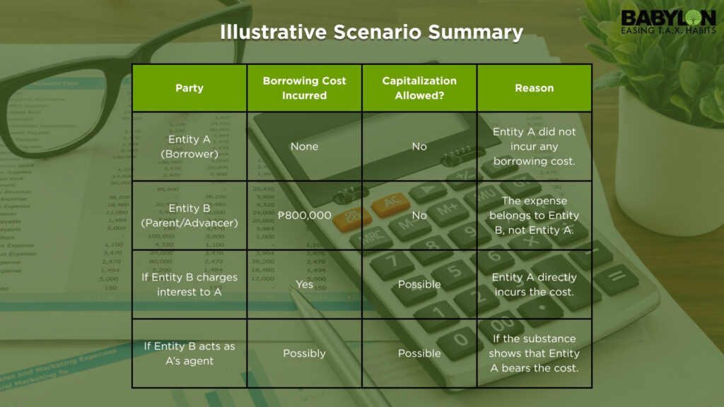 As stated under PAS 23, “Borrowing costs are interest and other costs incurred by an entity in connection with the borrowing of funds.” Thus, this limits capitalization strictly to expenses borne by the entity itself, not by any related or parent entity.