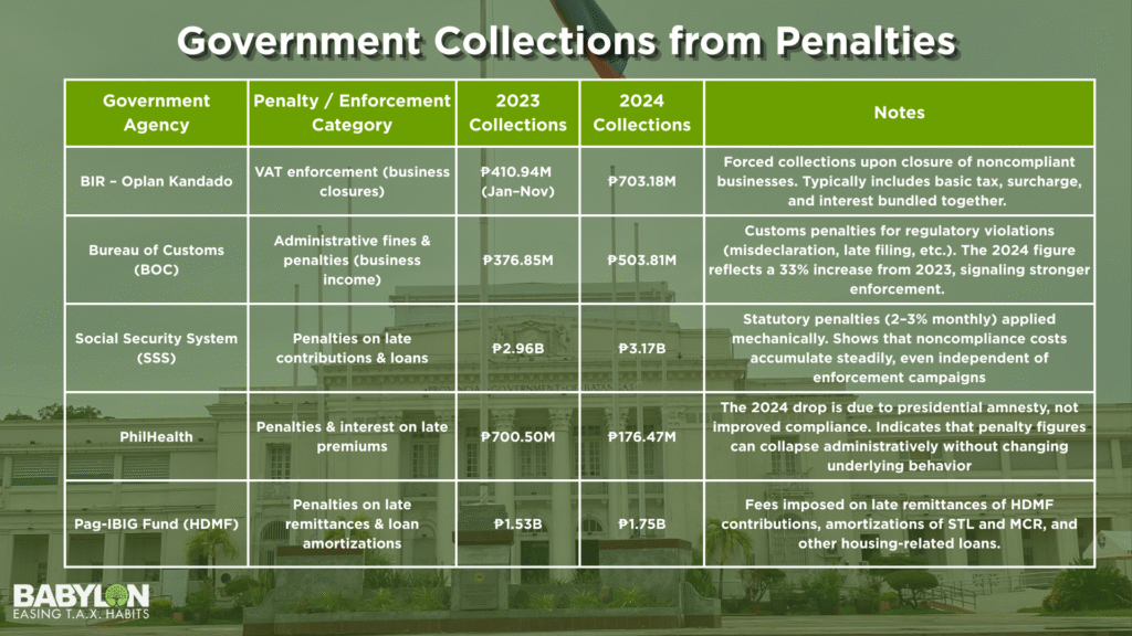 Non-compliance is not just a regulatory concept — it has a measurable financial impact on Philippine businesses. Government agencies collect millions to billions of pesos annually from penalties, surcharges, interest, and enforcement actions arising from late filings, unpaid contributions, reporting violations, and regulatory breaches.